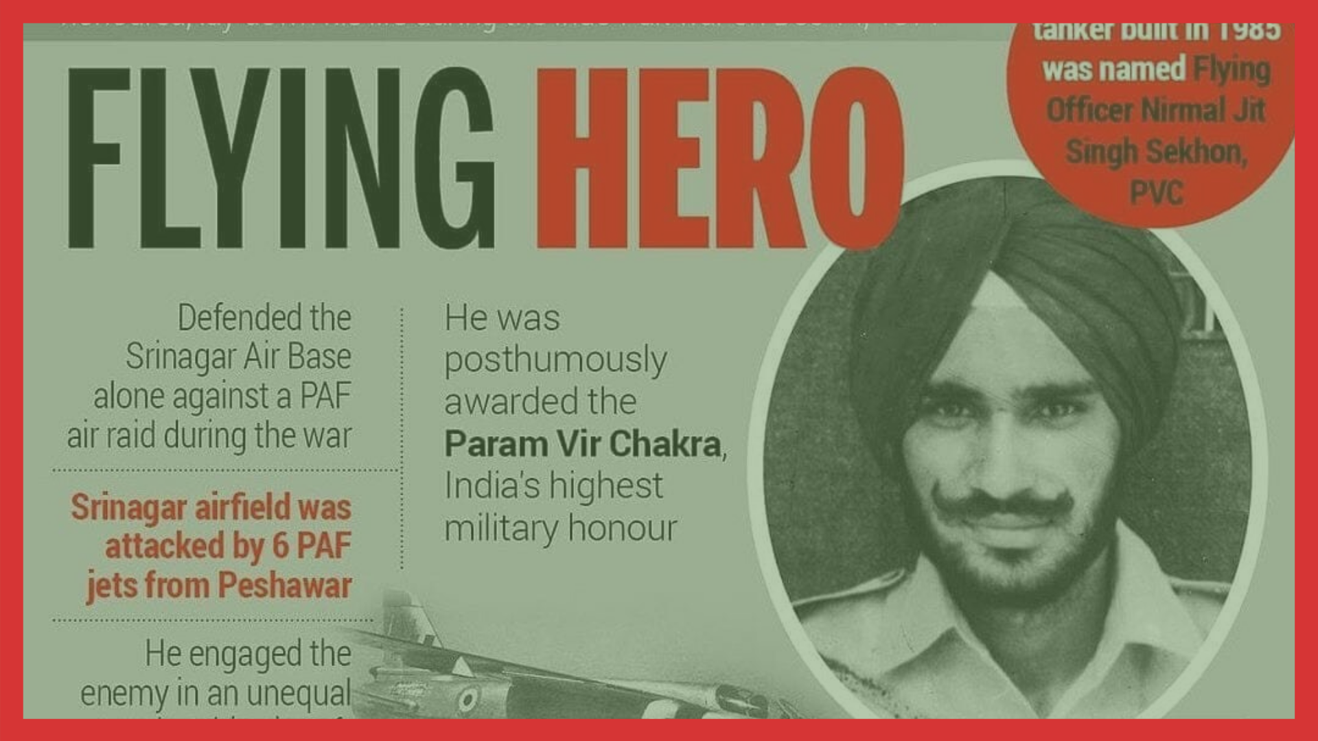 Flying Officer Sekhon fought the war single-handedly and also succeeded to shoot down one, making other 2 to escape and fought with the rest of the enemy.